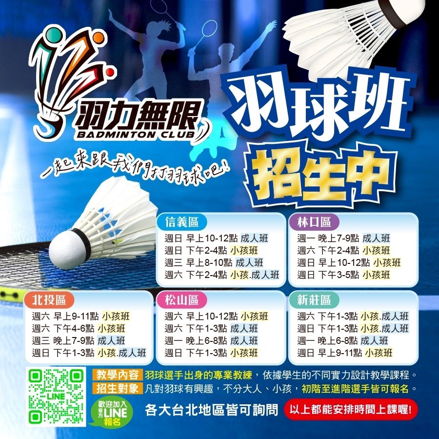 目前課程分布於信義區、林口區、北投區、松山區與新莊區,多時段彈性安排,無論平日或假日皆可選擇適合自己的上課時間。兒童班著重於基礎動作與運動興趣培養,成人班則強調技巧精進與實戰應用,讓不同族群都能找到適合自己的學習方式。如果你正在尋找專業、有系統且有成果的羽球教學環境,現在就是最好的開始時機。歡迎透過LINE與我們聯繫,了解課程內容與報名方式,開啟你的羽球進步之路。